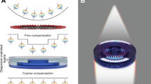 Achromatic metalenses represent a category of flat lenses constructed from sub-wavelength meta-atoms26,27,28,29,30,31,32. These meta-atoms arrange within a single layer and display different phase responses across various wavelengths, enabling the correction of chromatic aberration through the adjustment of wavelength-dependent phase dispersion. By utilizing the same diffraction order, the metalens focuses all wavelengths at a single point, effectively countering the issue of chromatic aberration. It is important to note that achromatic metalenses have faced the constraint regarding their NA, operating bandwidth, and size due to the limited capabilities in the phase dispersion of meta-atoms33,34,35,36. Especially for a high NA, this leads to a trade-off between the aperture size and the bandwidth of the achromatic metalenses. Many previous studies have focused extensively on expanding the phase dispersion capabilities of the meta-atoms27,28,37 to overcome such limitation. However, this improvement is very limited, and inevitably complicates both the development of the meta-atom library and the fabrication process. An alternative type of achromatic flat lens is the achromatic multi-level diffractive lens (MDL)38,39. For instance, large-scale achromatic MDLs have been designed and demonstrated to operate over a wide wavelength range with lens sizes up to 1 centimeter, but very small NAs of 0.139. The MDLs are capable of focusing different wavelengths at the same focal point by utilizing various diffraction orders instead of the same diffraction order. Therefore, they come with significant challenges when trying to achieve high NAs, including the high complexity of fabrication and a notable decrease in efficiency.