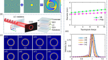 where \(j\frac{2\pi }{m} \,<\, \phi \,<\, (j-1)\frac{2\pi }{m}\,\forall j=1,{..}.,m\), \(\beta (\cdot )\) is the function that imparts the azimuthally variant phase gradient, m represents how many parts of the ring we decide to encode this variation, ℓ0 is the background topological charge, ℓ1 is a parameter that is responsible for both the amplitude of the phase gradient along one of the m sectors and of the overall topological charge of the beam. In this equation, we have to satisfy the condition ℓ0 < ℓ1. The two Heaviside functions HG and HC enable, respectively, the inversion of the azimuthal gradient sign and the inversion of the topological charge sign in each j-th sector.