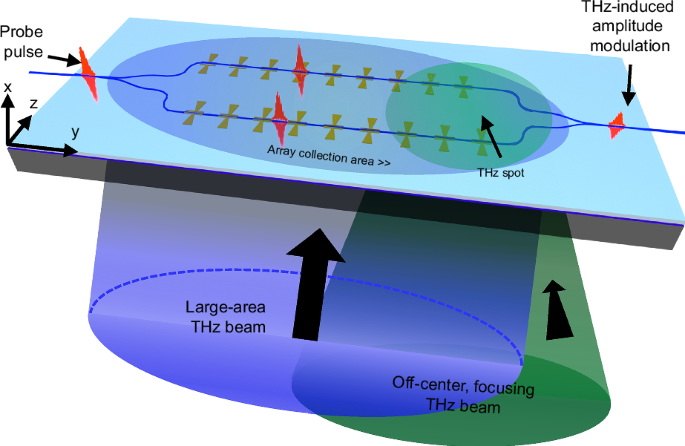 However, since the THz spot is often much larger than the probe, the THz energy is typically not efficiently converted to the optical domain. A potential solution for controlling the frequency response, phase-matching wavelength and simultaneously address shortcomings of bulk systems is transitioning these technologies to on-chip38,39,40. For instance, integrated antennas allow for simultaneously targeting a specific THz frequency range where the performance is optimized and achieving strong field enhancement beyond the diffraction limit41. This is in contrast with THz systems based on bulk crystals, where the sensitive bandwidth is dictated by the phase-matching condition. In previous demonstrations, THz antennas were integrated with chip-based plasmonic waveguides based on organic electro-optic molecules42,43,44. Despite the large second-order nonlinearity of the organic molecules, plasmonic approaches suffer from large propagation losses of (0.25 dB μm−1), which prevents the integration of multiple antennas so as to form a long sequence, thus hindering the realization of large photonic circuits. As a result, those devices were hampered by an inefficient collection of the THz power due to the large mismatch between the THz spot and the antenna collection area. Furthermore, the silicon-based integrated circuits suffer from large two-photon absorption, thus limiting the on-chip optical probe power and resulting in poor signal-to-noise ratio of the electro-optic detection45.