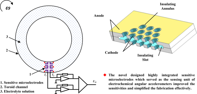 In this study, a micromachined electrochemical angular accelerometer with highly integrated sensitive microelectrodes was developed, where the electrode areas were significantly increased, leading to increases in device sensitivities. In addition, the fabrication process for the highly integrated sensitive microelectrodes was highly simplified, producing high consistencies in device fabrication. The following sections of the article include Materials and methods, Results and discussion, and a Conclusion.