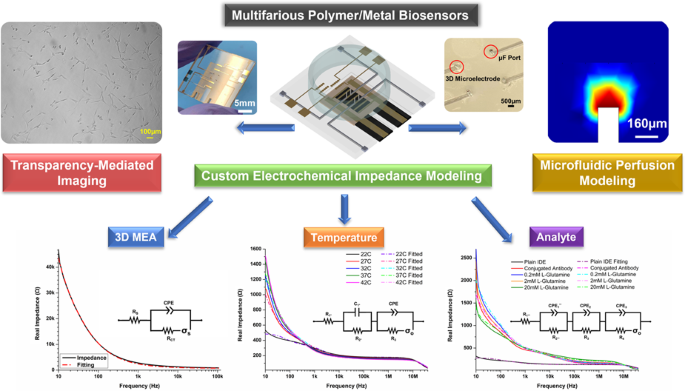 In this work, we demonstrate a compact, microfabricated polymer-metal biosensor platform for utilization in various “on-a-chip” applications. We demonstrate full integration of 3D microelectrodes, 3D microfluidics, IDE sensors, and a microheater, all on a single chip, and focus on impedimetric-based data analysis, as it can enable additional modalities for multifarious biosensor data analytics through frequency-dependent underlying circuit characteristics21,22. First, 3D microelectrode impedance characterization, as well as root mean square (RMS) noise levels, are investigated and modeled to indicate suitability for future electrophysiological measurements23. Next, differential temperature recordings are modeled and demonstrated using thin-film IDEs that are coupled to the resistive microheater, which is tuned to temperatures in the physiologically relevant range. A simplified plasma-enhanced conjugation regimen is additionally employed, and anti-l-glutamine antibodies are utilized in analyte detection using another integrated IDE. Sophisticated impedance modeling is utilized to identify differential equivalent circuits and extract resultant parameters for the IDE impedimetric data for both temperature and analyte detection. Standard biocompatibility and optical visualization performance of the selected materials utilizing C2C12 myocytes is presented in the supplementary data. Finally, we present COMSOL finite-element modeling (FEM) of microfluidic ports to demonstrate precise perfusion capabilities in a localized area. Together, these polymer-metal biosensor compound chip characterizations demonstrate the power of hybrid microfabrication in combination with modeling for the measurement of multiplexed datasets from electrogenic cellular models.