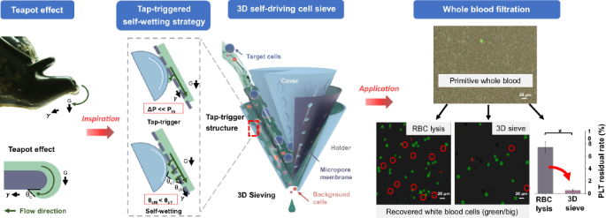 To demonstrate the improvement in performance attained by the proposed method, in the following section, we introduced the “teapot effect” into the device design and 3D-printed a tap-trigger microstructure. The structure was placed under the inclined micropore membrane with the liquid on it to observe and evaluate the liquid behavior (Fig. 1c, d). Then, we implemented this tap-trigger microstructure into a 3D cone-shaped cell sieving device, as shown in Fig. 1b. The 3D cell sieve was further applied for leukocyte filtration from whole blood, in which the tap-triggered self-wetting strategy was evaluated.