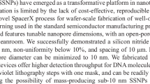 To demonstrate that nanopores with pyramid structures have excellent potential for biosensing tests were carried out. The blockage current during DNA translocation events was measured by a patch-clamp amplifier (Axopatch 200B, Axon Instruments, USA). The signal data were sampled at a rate of 500 kHz and low-pass filtered at 10 kHz. Then, the analog signals were converted into digital data by a data-acquisition module (Digidata 1440A, Axon Instruments, USA). The entire experiment was carried out on a vibration isolation table. Figure 9 shows the dwell time and blockage current distribution of λ-DNA (48.5 kbp, 1 ng/μL) passing through a pyramidal nanopore with a feature size of 11 nm under 0.4 V. The nanopore was filled with a buffer electrolyte of 1 M KCl, 10 mM Tris, and 1 mM ethylenediaminetetraacetic acid (EDTA) at pH = 8.0, and the current-time curves were measured between two Ag/AgCl electrodes placed across the SCS nanopore. It is evident from the results shown in Fig. 9a that the dwell time and blockage current of DNA molecules passing through the nanopore is concentrated in the dark area of the scattergram. The blockage current and dwell time shift is partially due to the symmetrical folding, breaks, and overlaps of a portion of the DNA. The inset figure shows more details about the typical ionic current signal. Figure 9b and c show the dwell time and blockage current distributions corresponding to Fig. 9a, respectively. The average blockage current is calculated to be 548.9 pA, and the transit time is calculated to be 1.77 ms. From this, we know that the DNA passing rate is 27.4 kbp/ms. It should be noted that many studies have confirmed that DNA movement in nanopores can be slowed by electrically modulating the wall surface charge based on a careful analysis of the induced electroosmotic flow and DNA−nanopore electrostatic interactions62,63,64, and the nanopores prepared in this report can also reduce the bias rate of DNA molecules by applying gate voltage65, which may indicate that the obtained SCS nanopores have good potential for biosensing.