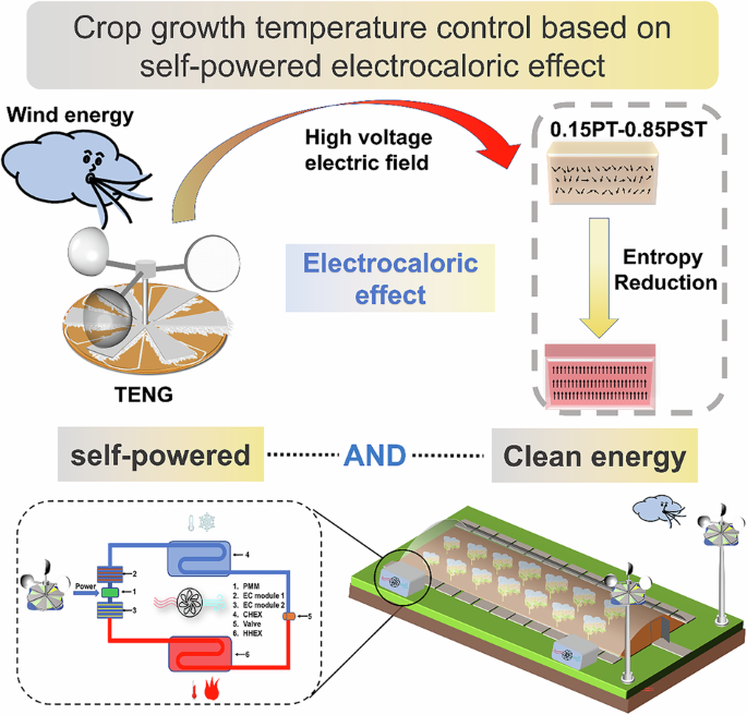 By leveraging the electrothermal effects of 0.15PT–0.85PST and the energy harvesting properties of the TENG, we develop a wind-powered, self-sustaining variable temperature testing system, which is designated SPT 1.0, as shown in Fig. 5a. The SPT 1.0 system is composed of a TENG, a management circuit (Fig. S12 in the ESM), an array of 0.15PT–0.85PST ceramic chips (comprising six units), a vacuum-sealed cup, and a high-precision thermometer. While the TENG remains stationary, the temperature within the vacuum cup is stable for 30 min. Upon activation, the TENG efficiently converts mechanical energy into electrical energy, creating a high-voltage electric field across the ends of the 0.15PT–0.85PST ceramic chips within the vacuum cup through circuit control. The electric field induces heating in the 0.15PT–0.85PST array due to its electrothermal effect. Once the TENG stops rotating, the accumulated charges at the ceramic chip ends are gradually discharged. Simultaneously, the temperature changes within the vacuum cup are monitored in real-time using a high-precision thermometer. The temperature change profile throughout the process after the rotary motor is initiated is shown in Fig. 5b. At 276 s, a temperature increase of 0.49 K is recorded within the vacuum cup, which remains constant at its peak value. After the electric field is removed from both ends of the 0.15PT–0.85PST ceramic sheet, the temperature rapidly decreases, returning to its initial state within 279 s (Video 1). Compared to previously published research27, the cooling and heating times are reduced by 31%, and the magnitude of temperature change that can be achieved through both cooling and heating can be increased by 81%. This improvement is primarily attributed to the FEP–rabbit fur rotating disc-shaped TENG, which exhibits excellent electrical performance, and 0.15PT–0.85PST, which demonstrates enhanced electrothermal performance. Furthermore, to enhance the thermal performance of the device and achieve subambient cooling effects, we refined the device, culminating in a new model called SPT 2.0 (Fig. S14). On the one hand, we have integrated controllable heat dissipation components into the original system to effectively achieve cooling below room temperature. On the other hand, we have increased the number of ceramic plates to significantly amplify the cooling temperature change capability of the device. We conduct tests on the cooling effect of the new device (Video 2). The operational process of SPT 2.0 differs from that of SPT 1.0. After undergoing the same initial heating process, SPT 2.0 introduces an additional heat conduction phase before the cooling process, during which the temperature inside the cup first decreases to a value near room temperature. Subsequently, the cooling process is initiated, and the temperature inside the cup decreases for a second time due to an increase in system entropy, resulting in subambient cooling (further details on the principles and processes can be found in Fig. S15). The results indicate that the temperature change of SPT 2.0 becomes substantially better than that of SPT 1.0. In the first phase of the heating process, SPT 2.0 achieves a temperature change of 1.19 K (from 296.48 K to 297.67 K), and in the third phase of the cooling process, SPT 2.0 achieves a cooling effect of 0.93 K (from 296.58 K to 295.65 K). Notably, SPT 2.0 successfully reduces the temperature inside the cup to 0.83 K below room temperature, demonstrating that an increased number of ceramic plates increases the change in cooling temperature. The outdoor environment abounds with wind energy, and rotating disc-shaped TENGs have natural advantages in harvesting low-frequency and disordered mechanical energy. Considering the significant impact of temperature on crop growth, we propose an agricultural production application scenario, as illustrated in Fig. 5c. The system harnesses environmental wind energy and converts it into electricity, which then regulates the temperature necessary for crop cultivation in agricultural greenhouses. This approach is undoubtedly a more environmentally friendly and cost-effective solution than other approaches.