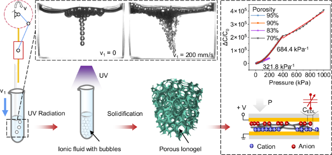 The highly resilient-compliance ionogel plays a significant role in force sensors. Porous ionogel with a 3D network skeleton has distinguished advantages compared to traditional microstructures, such as high compressibility48, light weight49, and absorbing ability50. Figure 1a illustrates the fabrication of a porous ionogel. The uniform N2 airflow via a needle, which was fastened on a periodic-motion slider, quickly penetrated the ionic fluid with high viscosity and continuous bubbles from the imported gas. The fluid was eventually exposed and solidified in the ultraviolet to form the porous ionogel (see details in “Methods” and Movie S1). For the bubble production, the motion velocity (v1) and airflow pressure (AP) are key elements that are related to the bubble size (Fig. S1, Supporting Information). The size decreases with decreasing APs and increasing v1 under the uniform ionic fluid and identical depths. Fig. S2 (Supporting Information) shows the experimental setup. When the air pressure is under 40 mbar, the pressure of the solution prevents air from blowing out of the pipe and cannot generate bubbles. Thus, we selected 40 mbar as the minimum air pressure to produce the smallest bubbles without the periodic motion by the slider.