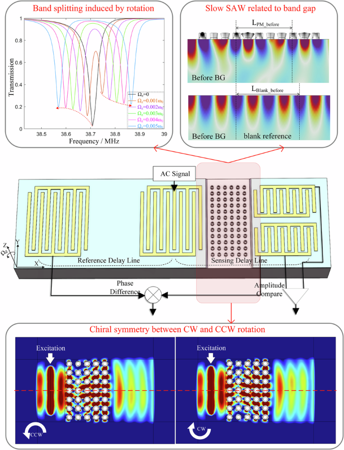 Based on the gyroscopic effects on the hollow-pillar PM demonstrated above, a novel SAW gyroscope is proposed and designed as Fig. 4a. The SAW gyroscope consists mainly of two kinds of delay lines, one of which containing PM serves for sensing while the other for reference. A bidirectional interdigital transducer (BIDT) connected to a continuous AC signal at fixed detection frequency is utilized to generate SAWs propagating along the positive and negative x axis. The SAW propagating along the positive x axis within the sensing delay lines interacts with PM to excite WGMs. And the phase velocity and amplitude of SAW within the area of PM are modulated by the rotation rate and direction around z axis, respectively. While the SAW propagating along the negative x axis keeps independent from the rotation and can be employed as the reference and temperature compensation signals. Therefore, there appears a rotation rate-dependent difference between the delay times of reference and sensing delay lines, as well as a rotation direction-dependent difference between the amplitudes of upper and lower sensing delay lines. Specifically, the differences of delay times and amplitudes can be accurately measured by lock-in and differential amplifiers, thereby the angular velocity is detected.