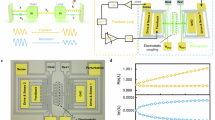 Figure 1a depicts a schematic of PT-symmetric silicon micromechanical resonators. The electrostatic coupling is achieved by applying a DC (direct current) bias across the two resonators. The resonators are placed in a controlled vacuum chamber so that the damping can be adjusted. The feedback loop detects a velocity-dependent signal from the resonator and returns as a force to the resonator, which is equivalent to the gain of the resonator. The signal input and output in both resonator are achieved via capacitance transduction. Figure 1b provides our fabricated silicon micromechanical resonators21,22.