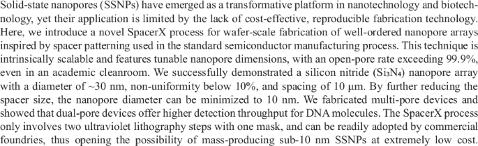 The SpacerX process involved only a single mask and two steps of UV lithography. We demonstrated a uniform nanopore array with ~30 nm diameter and 10 µm spacing. The nanopore size can be tuned by varying process parameters, and 10 nm diameter was realized. Si3N4 nanopore devices with multi-pore structures were successfully built. Similar to conventional spacer patterning techniques, the SpacerX process is fully compatible with wafer-scale mass production, making it intrinsically scalable and readily transferable to commercial foundries. This opens the possibility for the large-scale fabrication of sub-10 nm SSNPs at extremely low cost and high uniformity. Furthermore, the compatibility of this process with standard CMOS manufacturing lines significantly enhances its potential for future integration into CMOS systems, greatly improving the scalability and applicability of solid-state nanopore technologies.