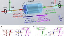 The experimental setup is illustrated in Fig. 6. The pumping light is emitted from a distributed Bragg reflector (DBR) semiconductor laser and coupled into a polarization-maintaining fiber (PMF). The pumping light is centered at the Rb D1 resonance wavelength and propagates along the z-axis. The optical path of the pumping light encompasses an adjustable collimator, a polarizing beam splitter (PBS), and a noise absorber (Thorlabs NEL03) to stabilize the optical intensity. Before entering the vapor cell, the light subsequently passes through a metasurface and an analyzer, ultimately achieving circular polarization with a QWP. The vapor cell, fabricated from cubic glass with an inner diameter of 3 mm and an outer diameter of 4 mm, is encased within a four-layer magnetic shielding. Under typical conditions, the cell is filled with a drop of naturally abundant Rb atoms, along with 2 Torr of 129Xe, 15 Torr of 131Xe, 200 Torr of N2 as a quenching gas, and 10 Torr of H2 serving as a buffer gas. The vapor cell is heated to 120 °C by using two 220 kHz AC heaters located in a boron nitride ceramic oven, with temperature monitored via platinum resistors, which work in concert to maintain the desired thermal conditions. The probing light is also sourced from a DBR laser diode and is introduced into the vapor cell through PMF. This probing light propagates along the x-axis and utilizes optical components like those in the pumping light path. The wavelength of the probing light is tuned to the vicinity of the Rb D2 line, delivering approximately 1.6 mW of linearly polarized light. The probing signal is demodulated and processed through a balanced detector (Thorlabs PDB210A) and lock-in amplifiers to extract information regarding atomic spin dynamics. Additionally, a set of triaxial coils is integrated within the magnetic shielding, controlled by the lock-in amplifiers, and powered by a precision current source to generate the magnetic field while compensating for residual magnetic fields. A static bias magnetic field of \({B}_{{z}_{0}}\) = 10 μT is applied along the z-axis to establish the quantization axis, with an RF magnetic field amplitude of Bc = 6.4 μT. The RF magnetic field frequency \({\omega }_{c}\), is in resonance with the Larmor frequency of Rb, while also applying a RF magnetic field along the x-axis, which resonates with the Larmor frequency of Xe.