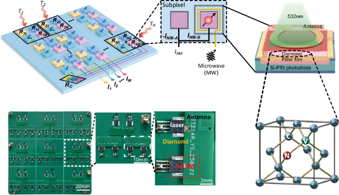 Herein, we demonstrate a temperature field detection and identification sensor based on a diamond array, where each unit operates as an ultrafast temperature sensor utilizing nitrogen-vacancy (NV) color centers. The zero-field splitting frequency shift of NV color centers occurs on a femtosecond timescale, comparable to electron transistions23,24. Operating under a fixed microwave frequency, the sensor’s response time is limited only by the photoresponse time of the Si-PIN photodetector (1–100 ns) and the intrinsic thermal conductivity of diamond [2000–2200 W/(m·K), the highest among all known solids25], resulting in a substantial speed advantage over conventional thermal sensors. Through precise microwave modulation in both frequency and power, we realize temperature responsivity that is tunable in both magnitude and polarity. Leveraging this tunable behavior, we construct an in-sensor computing (ISC) architecture that integrates sensing and computation within a unified physical layer. Specifically, the diamond array performs real-time matrix-vector multiplication of temperature intensities and responsivities, and utilizes Kirchhoff’s current summation law to execute fully connected artificial neural network (ANN) operations—directly on the analog sensor output. The resulting temperature field detection and identification diamond quantum sensor (TDI-DQS) integrates the ultrafast characteristics of quantum sensing with the computational efficiency of ISC26, eliminating the need for discrete memory and processor modules and avoiding massive redundant data transmission. This monolithic approach significantly reduces latency, power consumption, and hardware complexity, offering a compelling solution for high-speed, intelligent temperature sensing in advanced applications.