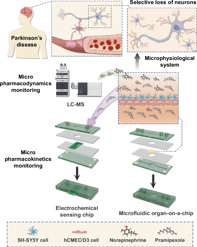 Admittedly, there are still some limitations existed in the proposed micro PK-PD study. First, LC-MS for pharmacodynamic monitoring, while highly accurate, is limited by expensive instruments and inability to achieve miniaturization. Currently, Zn single-atom-modified TiO2 substrate69 and indium tin oxide-modified optical fibers bundles70 have been constructed for in situ and real time monitoring of NE dynamics. Meanwhile, aptamer and methylene blue-assisted nanosensor71 and nanozyme film with dicopper-coordinated amino-ligands72 have achieved in situ electrochemical detection of neurosecretory events. Future work may focus on the development of a highly sensitive dual-channel electrochemical sensor to realize in situ micro PK-PD monitoring. Second, the biological characteristics of human neuroblastoma SH-SY5Y cells significantly differ from those of normal neurons, and thus they cannot fully reproduce the pathological features of Parkinson’s disease. Human induced pluripotent stem cell (hiPSC)-derived noradrenergic neurons possess genetic fidelity and the ability to recapitulate human-relevant disease phenotypes73,74. Third, the simplified BBB model, ignoring the surrounding pericytes and astrocytes, may weaken the BBB integrity in vitro to some extent26,27. Our subsequent research aims to establish a higher-fidelity model comprising hCMEC/D3 endothelium interfaced with astrocytes and pericytes, thereby more accurately recapitulating barrier function of the in vivo human BBB. Finally, while this current study merely focused on a clinical drug, future directions will extend this micro PK-PD approach to novel nanodrug candidates with merits of targeting brain lesion areas, high biocompatibility and ease of functionalization. Hence, microfluidic organ-on-a-chip coupled multi-channel electrochemical sensor using hiPSC-derived neurons for micro PK-PD study of novel nanodrug candidates is the direction of our future efforts.