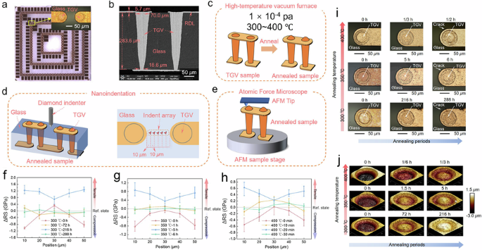 To verify the reliability of the fitting curve in Fig. 5a–c, the TGV sample is annealed at 300 °C for 14.2 h, at 350 °C for 48.3 min and at 400 °C for 10.4 min, exact periods that need to achieve reference state as predicted by the fitting curve, and the residual stress on the glass near the TGV-RDL edge is measured. The result is shown in Fig. 5d.