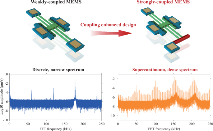 In summary, we have demonstrated a systematic method for enhancing the energy exchange rate in internally coupled MEMS resonators through targeted structural design and dynamics study. Two devices with distinct coupling coefficients are fabricated and characterized via both experiments and numerical simulations. A theoretical model describing the proportional relationship between the energy exchange rate and key resonator parameters was developed. By sweeping the driving frequency, the positive correlation between the energy exchange rate and the torsional amplitude is verified and the proportional coefficient \(C\) is quantitatively determined through numerical fitting. Notably, the enhanced coupling coefficient in Device B facilitated broader comb spacings and a significantly expanded spectral range of MFCs, leading to a supercontinuum MFC spanning over a decade in bandwidth. These findings provide a design-oriented strategy for dynamic spectral control of MFCs, with promising implications for precision timing, frequency synthesis, and on-chip signal processing.
