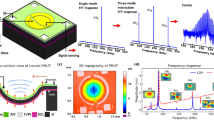where \(\tau =\sqrt{\frac{{k}_{11}}{{m}_{1}}}t={\omega }_{1}t\), \({Q}_{2}=\frac{{m}_{2}{\omega }_{2}}{{\gamma }_{2}}\), \(p=\frac{{\omega }_{2}}{{\omega }_{1}}\), \(h=\frac{1}{\sqrt{\frac{{k}_{13}}{{k}_{11}}-\frac{\kappa }{{k}_{11}}}}\), \({c}_{1}={\gamma }_{1}\sqrt{\frac{1}{{k}_{11}{m}_{1}}}\), \({c}_{2}=\frac{p}{{Q}_{2}}\), \(\alpha =\frac{\kappa {h}^{2}}{{k}_{11}}\), \(f=\frac{F}{{k}_{11}h}\), and \({\omega }_{d}=\frac{\Omega }{{\omega }_{1}}\). The coupled dynamic equations are numerically solved using a four-step variable length Runge–Kutta method. Resonator parameters can be extracted by fitting the simulated amplitude-frequency response curves to experimental data (details about parameter extraction is in Supplementary Section 4 of Supplementary Information).