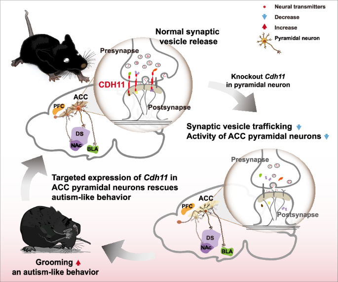 In the present study, we employed multidisciplinary approaches to investigate how CDH11 affects the development and function of ASD-related brain circuits using Cdh11-deficient mice. Our findings reveal that CDH11 is enriched at synapse of ASD-associated brain regions including ACC and is essential for the trafficking of presynaptic vesicles, with deficits in this function leading to repetitive behaviors. This study provides new insights into the molecular mechanisms underlying the repetitive behaviors associated with ASD.