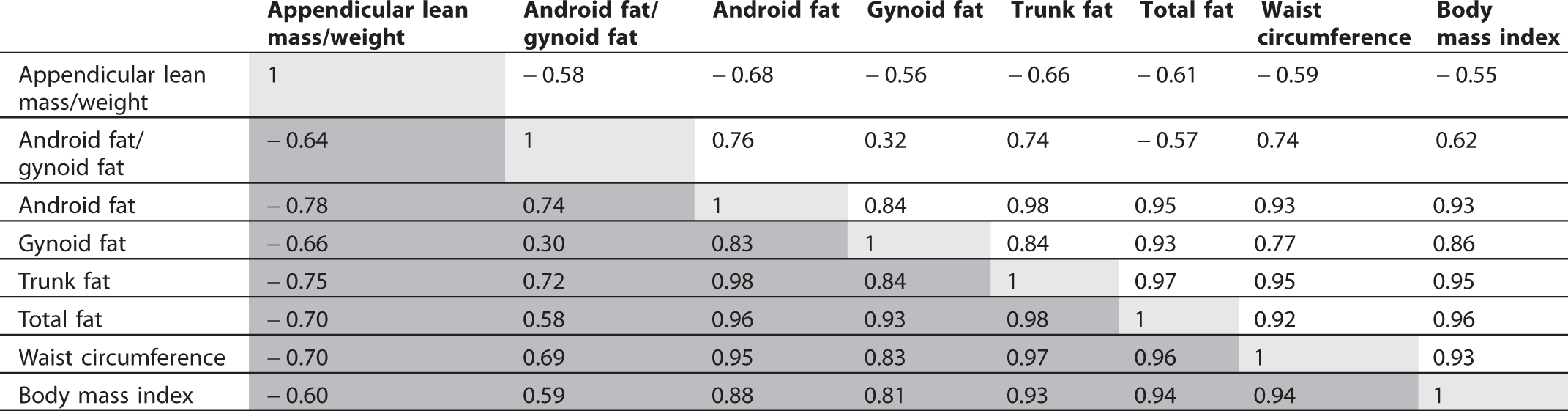 1. Grey boxes signify correlations in men. White boxes signify correlations in women. All correlations are significant at p < 0.0001.