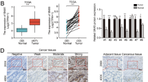 The protein expression of cell lines as well as the fresh-frozen tumor samples and matched adjacent non-tumor tissue was performed in radio immunoprecipitation assay buffer (KeyGEN, Nanjing, China). 50 μg of protein lysate was loaded on a 10% SDS-PAGE gel and separated by electrophoresis. The proteins were transferred to polyvinylidene fluoride membranes (Millipore, Billerica, MA, USA). The membranes were incubated with various antibodies (Supplementary Table S2) overnight at 4 °C. The primary antibodies were detected using corresponding secondary antibodies (Supplementary Table S2). All experiments were repeated in triplicate, and the representative results were shown.