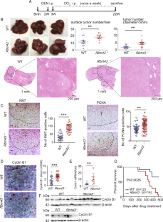 RNA-binding proteins play key roles in the posttranscriptional regulation of mRNA during cancer progression. Here, we show that RNA-binding motif protein 43 (RBM43) is significantly downregulated in human tumors, and its low expression is correlated with poor prognosis in patients with HCC. Overexpression of RBM43 suppressed cell proliferation in culture and resulted in the growth arrest of tumor xenografts, whereas downregulating RBM43 played an opposite role. We have also demonstrated that overexpression or knockdown of RBM43 affects the cell-cycle progression of liver cancer cells. Mechanistically, RBM43 directly associated with the 3′UTR of Cyclin B1 mRNA and regulated its expression. Moreover, loss of Rbm43 in mice promoted liver carcinogenesis and HCC development after diethylnitrosamine (DEN)-carbon tetrachloride (CCl4) treatment. Taken together, our data indicate that RBM43 is a tumor suppressor that controls the cell cycle through modulation of Cyclin B1 expression, providing evidence that RBM43 is particularly important in HCC.