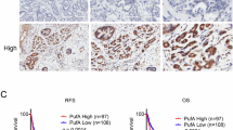 Formalin-fixed paraffin sections were incubated overnight with antibodies against Puf-A, p53 (NCL-P53-DO7, Novocastra, Leica Biosystems, UK), and Ki-67 (NCL-L-Ki-67-MM1, Leica Biosystems). After washing, tissue slides were incubated with biotinylated secondary antibodies for 1 h at room temperature, and then incubated with horseradish peroxidase-conjugated streptavidin (Vector, USA). All sections were counterstained with Mayer’s hematoxylin. Puf-A, p53, and Ki-67 stained tissue sections were read by the pathologist YLH and evaluated with a histological scoring system, H-score [49]. Ki-67 was low if there is <14% of nuclei staining and high if ≥14% [50, 51]. The Youden index, which was calculated from the receiver operating characteristic curve, was used to determine the optimal cut-off value for high versus low expression level.