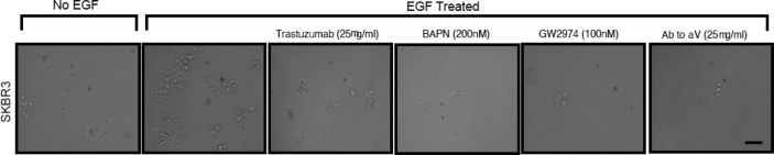 Supplementary Figure S5: Effects of specific drugs on EGF-induced invasiveness of HER2-overexpressing breast cancer cell lines grown in extracellular matrix: SKBR3 cells were plated in MatrigelTM and treated without or with EGF for 4 days. Thereafter, the cultures were grown for 8 additional days in the absence or presence of the following agents: an anti-HER2 antibody (Trastuzumab, 25 μg/ml), the dual HER2 and EGFR kinase inhibitor, GW2974 (100 nM), the lysyl oxidase inhibitor, β- aminopropionitrile (BAPN; 200 nM), or a blocking antibody specific to integrin alpha V (25 μg/ml). The phase contrast images were taken on day 12. Scale bar; 100 μm.