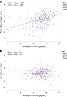 After adjusting for covariates, black race was associated with higher weight gain velocity but not higher BF% z-scores.