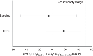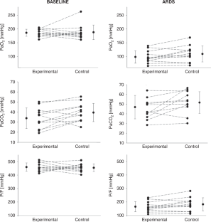 P/F did not differ significantly between the experimental and the control ventilation at baseline (459.6(30.9) vs 454.4(28.6) mmHg) and during ARDS condition (165.1(36.9) vs 182.5(48.4) mmHg). The upper 95% CI of the difference between P/F after ventilation using the control and the experimental ventilator was 37.3 and 44.1 mmHg during baseline and ARDS, respectively.