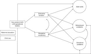 Structural equation modelling indicated that very preterm children exhibited significantly lower math skills compared to term-born peers. This association was partially mediated by reduced executive functions and receptive vocabulary at preschool. No total or direct effects were found between very preterm birth and behavioural or emotional difficulties, but indirect effects, via general cognitive abilities, were observed.
