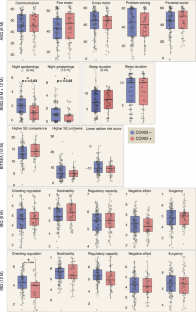 Overall, COVID+ and COVID− infant groups showed no significant differences across a range of neurobehavioral measures. However, analyses not adjusted for multiple comparisons revealed differences: fewer night awakenings at 6 (t(154) = 2.24, p < 0.03) and 12 months (t(107) = 1.94, p < 0.05), and reduced duration of orienting at 12 months (t(55.38) = 2.15, p < 0.04) in COVID+ infants. Neural differences were noted in posterior-anterior midline, insular-frontal, insular-posterior cingulate, and frontal-cingulate regions at an uncorrected threshold of p < 0.01.