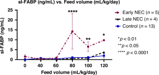 Of 96 patients enrolled, 9 were diagnosed with NEC. sI-FABP values remained low in healthy controls and NEC patients at the initial stages of feeding, up to 60 mL/kg/day. In those who developed NEC, there was a significantly higher sI-FABP at the final sample compared to their own earlier samples (p < 0.0001) or matched controls (p < 0.001). Those who developed NEC while feed volumes were being increased had a significantly higher sI-FABP than others. Receiver operating characteristic (ROC) curve analysis identified sI-FABP of 4.8 ng/mL to be predictive of early NEC with 80% sensitivity and 100% specificity (AUC 0.92; p < 0.01).