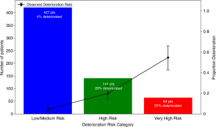 Performance was strong, with high area under the curve values and negative predictive values above 96%. Predictive features included supplemental oxygen use, fever, low oxygen saturation, age, and abnormal laboratory values.
