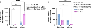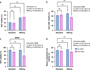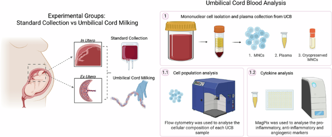 Forty-two samples (n = 10 standard in utero, n = 10 standard ex utero, n = 10 milking in utero, n = 12 milking ex utero) were analyzed for blood volume, mononuclear cell count, and cellular composition via flow cytometry. Key cell populations included hematopoietic stem cells (CD34 + CD45 + ), endothelial progenitor cells (CD45 + CD34 + CD31 − CD133 + ), and mature endothelial cells (CD34 − CD45 − CD31 + ). Plasma cytokines, including inflammatory and angiogenic markers, were also assessed.