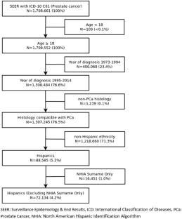 Retrospective analysis of 72,134 adult Hispanics with PCa between 1995 and 2014. Origin was Mexican (N = 16,995; 24%), South/Central American (N = 6949; 10%), Puerto Rican (N = 3582; 5%), Cuban (N = 2587; 4%), Dominican (N = 725; 1%), Hispanic not specified (NOS, N = 41,296; 57%), as coded by SEER. Patient and PCa characteristics were analyzed with chi-square and Kruskal–Wallis tests. Overall and PCa survival were analyzed with Kaplan–Meier and Cox models adjusting for baseline variables.