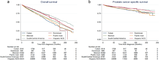 At diagnosis, Mexicans had more advanced stage, higher prostate-specific antigen, and higher Gleason score while Cubans and Dominicans had more favorable PCa at diagnosis (all P < 0.05). After a median follow-up of 69 months, 20,317 men died, including 6223 PCa deaths. Compared to Mexicans, Cubans (HR = 1.22, 95% CI = [1.14–1.30]) and Puerto Ricans (HR = 1.15 [1.08–1.22]) had worse overall survival while Dominicans (HR = 0.76 [0.64–0.91]), South/Central Americans (HR = 0.68 [0.65–0.72]), and NOS (HR = 0.81 [0.78–0.84]) had better overall survival. Compared to Mexicans, Cubans (HR = 1.08 [0.96–1.22]) and Puerto Ricans (HR = 1.03 [0.92–1.15]) had similar PCa survival while Dominicans (HR = 0.72 [0.53–0.98]), South/Central Americans (HR = 0.67 [0.60–0.74]), and NOS (HR = 0.68 [0.64–0.73]) had significantly better PCa survival.
