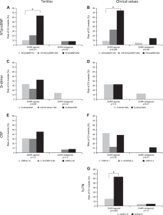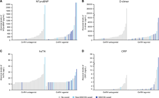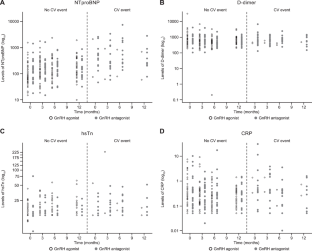 Baseline and disease characteristics of the 80 patients who took part in the study were well balanced between treatment arms. Ischemic heart disease (66%) and myocardial infarction (37%) were the most common prior CVD and the majority (92%) of patients received CV medication. We found that high levels of NTproBNP (pā=ā0.008), and hsTn (pā=ā0.004) at baseline were associated with the development of new CV events in the GnRH agonist group but not in the antagonist. In addition, a nonsignificant trend was observed between higher levels of NTproBNP over time and the development of new CV events in the GnRH agonist group.