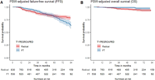 Following the eligibility criteria PSA < 20 ng/mL, Gleason score ≤ 7 and T-stage ≤ T2c, we included 830 radical (440 radiotherapy, 390 prostatectomy) and 530 focal therapy (cryotherapy, high-intensity focused ultrasound or high-dose-rate brachytherapy) patients treated between 2005 and 2018 from multicentre registries in the Netherlands and the UK. A propensity score weighted (PSW) analysis was performed to compare failure-free survival (FFS), with failure defined as salvage treatment, metastatic disease, systemic treatment (androgen deprivation therapy or chemotherapy), or progression to watchful waiting. The secondary outcome was overall survival (OS). Median (IQR) follow-up in each cohort was 55 (28–83) and 62 (42–83) months, respectively.