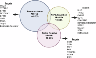 Among the literature, 13 novel targets with robust supporting literature were found. Targets were subsequently divided into targets of interest in AR-positive and AR-negative (NEPC and/or double negative) mCRPC. Ongoing and completed trials for imaging and/or therapeutics leveraging these targets was described.