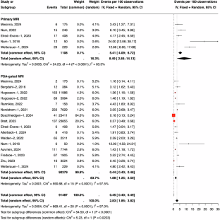 Pubmed, Embase, Web of Science, CENTRAL, Scopus and Google Scholar were searched using key terms of “MRI”, “prostate cancer”, and “screening” from 01/1/2000–20/4/2024. We included studies investigating the general adult male population not otherwise risk stratified, and extracted outcomes of CDR for csPCa (ISUP Grade Group ≥ 2) and clinically insignificant prostate cancer (ciPCa) (ISUP Grade Group 1), and biopsy rate.