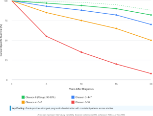 Fifteen major studies encompassing 43,127 patients (median follow-up 15–30 years) demonstrated heterogeneous progression patterns. Ten-year prostate cancer-specific survival ranged from >95% for Gleason 6 tumors to <60% for Gleason 8–10 disease. Grade Group 1 tumors showed <5% metastatic risk over 15–20 years, while Grade Groups 4–5 exhibited rapid progression with median disease-specific survival <5 years. Across all risk groups, disease progression accelerated markedly after 15 years. Men diagnosed after age 75 faced substantial competing mortality (~57–60% 10-year non-cancer mortality), regardless of tumor grade.