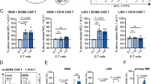 All CAR T designs used in this study have been described in our previous reports.16,19 Different CAR constructs in this study are displayed in supplemental Fig. 5a, b. The CAR constructs were synthesized and cloned into the lentivirus PRRLSIN-EF-1α-GFP vector. pRRLSIN and PSPAX2 and PMD2G packaging plasmids were transfected into 293T cells. Lentiviral supernatants were harvested 48 h later and stored at −80 °C. Peripheral blood mononuclear cells (PBMCs) were derived from healthy donors. One microgram/mL anti-CD3 monoclonal antibody (OKT3, Takara, Japan) and RetroNectin (Takara) were precoated overnight at 4 °C to activate T cells. Primary T cells were cultured in X-VIVO 15 medium (Lonza, Switzerland) containing 10% fetal bovine serum (Gibco) and 300 U/ml recombinant human IL-2 (PeproTech, USA). After 2 days, the virus supernatant was added to RetroNectin-coated plates and centrifuged for 2 h at 2000×g. Activated T cells and 4 μg/mL polybrene (Sigma–Aldrich, USA) were added to the plates and centrifuged at 1000×g for 10 min. After 24 h, CAR T cells were replaced with fresh medium to reduce the toxicity of polybrene. CAR T cells were maintained in X-VIVO 15 medium containing 300 U/ml recombinant human IL-2.