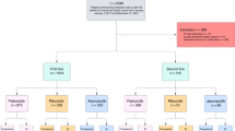 Variables following binomial distributions (i.e. response rate), were expressed as frequencies and percentages. Comparisons between qualitative variables were done using the Fisher Exact Test or Chi-square. Comparisons between quantitative and qualitative variables were performed through non-parametric tests (U of Mann–Whitney or Kruskal–Wallis). Time-to-event variables (OS and PFS) were measured from the date of trial enrollment and were estimated according to the Kaplan–Meier method. Comparisons between the variables of interest were performed using the log-rank test. All p-values reported were two-sided, and statistical significance was defined at p < 0.05.