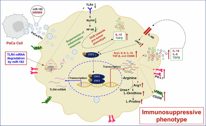Small RNA sequencing-based characterization of PaCa-EVs derived from established and PDX PaCa cell lines allowed us to identify the crucial role of miR-182-5p as a regulatory mediator of macrophage phenotype in PaCa. Previous studies suggest that miR-182 may contribute to tumor growth, invasion, and metastasis in various cancer types including PaCa.96,97,98,99 However, this study is among the first to conduct an in-depth investigation into the immunomodulatory effects of miR-182-5p, which is enriched in PaCa-EVs. Furthermore, we observed a significant elevation of miR-182-5p in PaCa-patient plasma EV-cargo, corroborating our findings with established and PDX PaCa cell lines. We also confirmed that human PBMC-derived macrophages treated with patient plasma-derived EVs showed higher expression of TAM markers like CD206, CD163, IL-10, TGF-β, and STAT3. Target prediction analysis, as well as subsequent validation studies, suggested that miR-182-5p targets TLR4 at the mRNA and protein levels in PaCa-EV-treated BMDMs. It is well recognized that TLR4 enables macrophages to adopt a pro-inflammatory state by triggering MYD88-dependent NF-κB signaling.100 Hence, miR-182-5p-mediated TLR4 downregulation would augment a preferential skewing of macrophages towards an M2-like TAM phenotype through upregulation of an anti-inflammatory state and concomitant activation of JAK/STAT3 signaling. Indeed, we found that treatment of BMDMs and THP-1 macrophages with PaCa-EVs leads to the activation of the JAK2/STAT3 signaling pathway (phosphorylation of JAK2 and STAT3), thereby skewing them towards a pro-tumorigenic M2-like phenotype and enhanced PD-L1 expression on cell surface. Many studies have shown a direct correlation between STAT3 phosphorylation/activation and elevated PD-L1 expression in cells,71,101,102 which could, in part, explain the observed increase in PD-L1 expression on macrophages. Separately, we found that PaCa-EV-treated macrophages suppress CD8+ T cell proliferation under in vitro and in vivo conditions. Interestingly, pharmacological inhibition of JAK/STAT3 signaling in BMDMs prior to PaCa-EV treatment showed a significant alleviation of CD4+ and CD8+ T cell suppression. Furthermore, the activation of the JAK/STAT pathway in PaCa-EV educated BMDMs was associated with decreased expression of TLR4, which is known to induce an inflammatory response.103,104 While the establishment of precise underlying signaling mechanisms will require further investigations, these findings nonetheless suggest a strong correlation between the JAK/STAT3 signaling pathway and the immunosuppressive phenotype of PaCa-EV-treated macrophages.