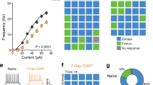To confirm that chronic CORT administration (5 mg/kg/day) mimics the effects of chronic stress, we assessed behavior in the open field (OF) and forced swim test (FST) (Fig. 1a) in Vehicle (n = 20) and CORT-administered (n = 20) mice, as well as novelty-suppressed feeding (NSF) in a separate group of Vehicle (n = 10) and CORT-administered (n = 10) mice. Similar to previous reports1, unpaired t-tests revealed that chronic CORT administration reduced overall locomotor activity in the OF (t(37) = 4.5, p < 0.001, Fig. 1b), entries into the center of the OF (t(37) = 5.5, p < 0.001, Fig. 1c), and percent time spent in the center (t(37) = 3.5, p < 0.001, Fig. 1d). Furthermore, chronic CORT increased latency to eat in NSF (Kaplan-Meier survival, X2(2, N = 9) = 22, p < 0.0001) (Fig. 1e) in a separate cohort of Vehicle (n = 10) and CORT-administered (n = 10) mice, without affecting latency to eat in the home cage (t(18) = 0.83), p = 0.419) (Supplemental Fig. 1a), suggesting the increase in latency is not affected by group differences in hunger. However, similar to previous reports1, chronic CORT did not affect immobility in antidepressant-sensitive FST (t(37) = 0.017), p = 0.987, Fig. 1f). Taken together, these results confirm that chronic CORT administration induces negative valence behaviors associated with potential threat in the OF and NSF.
