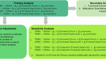 Genes of interest previously identified in the literature in studies investigating PND and DNA methylation [15, 17, 27, 31] were also analyzed separately. In this analysis, adjustment of the p value for multiple comparisons was based on the number of CpGs in the genes of interest, according to the Illumina manifest. Included genes of interest were: nuclear receptor subfamily 3 group c member 1 (NR3C1), collagen type VII alpha 1 chain (COL7A1), zinc finger protein 575 (ZNF575), maternally expressed gene 3 (MEG3), solute carrier family 6 member 4 (SLC6A4), hydroxysteroid 11-beta dehydrogenase 2 (HSD11B2), FKBP prolyl isomerase 5 (FKBP5), brain derived neurotrophic factor (BDNF), insulin like growth factor 2 (IGF2), PLAG1 like zinc finger 1 (PLAGL1), mesoderm specific transcript (MEST), and paternally expressed 3 (PEG3) [15, 17, 27, 31].