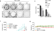 We used a mouse xenograft model to examine the synergistic effect of cepharanthine and epirubicin and determine whether our in vitro findings that cepharanthine can sensitize to epirubicin-induced cell death could be replicated in vivo. Once the implanted cells had developed into tumors after 6 days of inoculation, mice were received injections of either vehicle, cepharanthine (12 mg/kg), epirubicin (2 mg/kg) or both agents in combination for more than 80 days. Kaplan–Meir survival analysis revealed that the median survival time of the vehicle control group (n = 10) was approximately 33 days. Exposure of mice only to cepharanthine or epirubicin resulted in minor increases in their survival time (34.5 or 40 days, n = 10). However, a combination of cepharanthine/epirubicin significantly increased the median survival of the mice to 60.5 days (P < 0.001 compared to vehicle control or epirubicin treatment alone) (Fig. 2a). Single-agent treatment with either cepharanthine or epirubicin did not significantly reduced tumor volume relative to vehicle treatment (Fig. 2b, c). However, the combination of cepharanthine/epirubicin led to a significant reduction in tumor volume at day 12 relative to monotherapy alone (P < 0.05, Student’s t test, two-tailed, unpaired), and these events became more apparent at days 18, 24, 30 and 36 (P < 0.01 or P < 0.001) (Fig. 2b, c). No significant decrease in body weight or lethal toxicity was observed among vehicle control, cepharanthine or epirubicin treatment alone, and combination of cepharanthine/epirubicin (Fig. 2d).