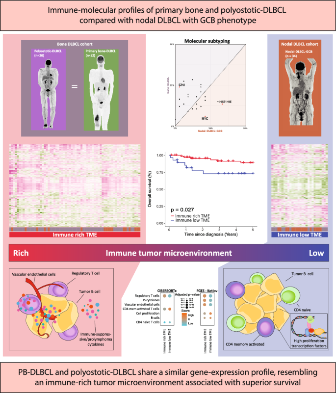 In conclusion, this study is the first to demonstrate that PB-DLBCL and polyostotic-DLBCL share similar mutational and gene-expression profiles, distinct from those of nodal-DLBCL-GCB, supporting the rationale for their classification as a unified bone-DLBCL entity. Furthermore, bone-DLBCL is linked to an immune-rich tumor microenvironment, characterized by an abundance of specific T-cell subsets and correlated with superior survival outcomes. Consequently, these patients may benefit from less intensive treatment strategies. Our findings emphasize the potential to tailor novel immunomodulatory strategies, like IMIDs, bispecific antibodies or CAR T-cell therapy, according to specific mutational profiles and TME signatures. This targeted approach could enhance treatment efficacy, reduce immuno-chemotherapy toxicity, and improve survival outcomes for patients with bone-DLBCL.