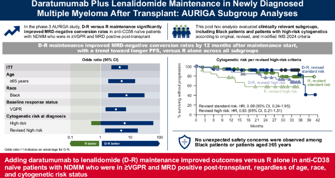In summary, results of this post hoc analysis of AURIGA showed the consistent ability of D-R maintenance compared with standard-of-care R maintenance alone to improve MRD-negative (10–5) conversion rate, depth of response, and a trend towards PFS improvement among anti-CD38 mAb–naïve patients with NDMM who were MRD positive post-ASCT with either high-risk or standard-risk disease. Additionally, no unexpected safety concerns were observed among patients aged ≥65 years or Black patients. This study supports the addition of daratumumab SC to R maintenance in all transplant-eligible patients with NDMM regardless of age, race, and cytogenetic risk status; however, additional studies with larger sample sizes are needed to confirm these findings.