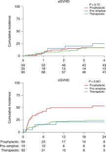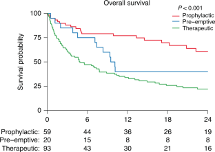 The original online version of this article was revised: The color coding for our three subsets of patients were not identical in Figure 1 and Figure 2. While the “therapeutic” subset appears in green in both figures, the “pre-emptive” group appears in blue in Figure 1 and in red in Figure 2. Conversely, the “prophylactic” group appears in red in Figure 1, and in blue in Figure 2. The order the three groups appear in the legend is also different. This presentation may be confusing to future readers, and thus we would like to substitute a new version of this two figures where the sole modification is harmonization of the color coding, and of the order in entries in the legend.