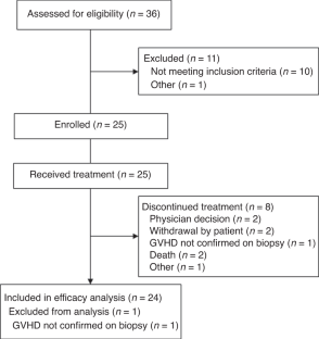 The authors would like to thank the investigators from the study sites: Zaid Al-Kadhimi (Emory University Hospital, Atlanta, GA, USA), George Liwei Chen (Roswell Park Cancer Institute, Buffalo, NY, USA), Iskra Pusic (Washington University School of Medicine, St. Louis MO, USA), Michele Donato (John Theurer Cancer Center, Hackensack University Medical Center, Hackensack, NJ, USA), and Stéphane Vigouroux (Centre F. Magendie, Hospital Haut-Leveque, France). The authors thank John Levine, James Ferrara, (Icahn School of Medicine at Mount Sinai, New York, NY), and Susan Abraham (University of Texas MD Anderson Cancer Center, Houston, TX) for contributions to the biomarker analyses. The authors also thank from Alexion Pharmaceuticals: Richard Riese, Susan Faas, and Mittie Doyle for contributions to study design, Kaushik Patra and Fanny O’Brien for extensive review of the data, and Rima Saliba for providing statistical guidance. This study was supported by research funding from Alexion Pharmaceuticals Inc. Medical writing support was provided by Bioscript Group, Macclesfield, UK, funded by Alexion Pharmaceuticals Inc.