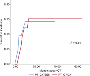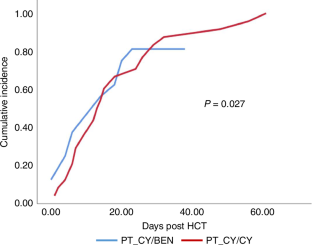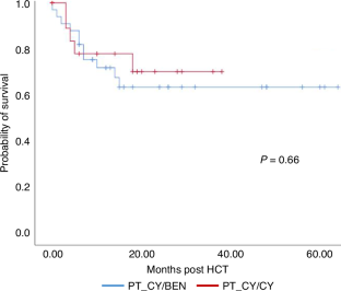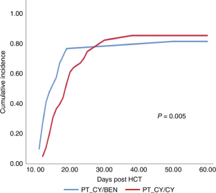 PT-CY use in T cell-replete haploidentical HCT has significantly improved outcomes. However, hyperhydration with MESNA in CY administration poses a challenge, in patients with cardiac/ renal problems. PT-CY also increases VOD risk with prior exposure to hepatotoxic drugs. Katsanis et al. in a phase Ia trial in patients undergoing HCT for hematological malignancies showed that partially replacing PT-CY with PT-BEN had comparable outcomes to conventional PT-CY. We conducted an ambispective study in 54 patients [haplo (39), MSD(14), and MUD(1)] with nonmalignant hematological disorders and hematological malignancies in pediatric and adult patients undergoing HCT (MAC/RIC) from February 2019 to May 2024. GvHD prophylaxis comprised of PT-CY/BEN (PT-CY 50 mg/kg Day +3; PT-BEN 90 mg/m2 Day +4) in a prospective arm (n = 21) and PT-CY/CY (50 mg/kg on Days +3, +4; comparator arm) in ambispective (prospective 12; retrospective 21) arm. In both groups, immunosuppression with CNI and MMF was also given. PT-CY/BEN was comparable to PT-CY/CY in terms of safety, efficacy, and GVHD prevention. In the PT-CY/BEN group, there was earlier neutrophil (0.008) and platelet (0.0057) engraftment with significantly lower BK viremia. Incidence of bacterial infection, TRM, EFS, and OS were comparable in both groups.