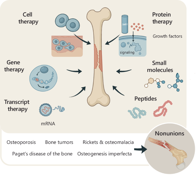 Furthermore, we discuss the potential applications of these biologic therapies across diverse patient populations, with a focus on individuals affected by osteoporosis, osteogenesis imperfecta, rickets, osteomalacia, bone tumors, and Paget’s disease. By evaluating the efficacy and safety profiles of these therapies in various pathological contexts, we aim to underscore their transformative potential in addressing the unmet needs of bone regeneration and fracture healing.
